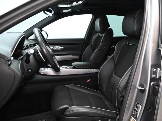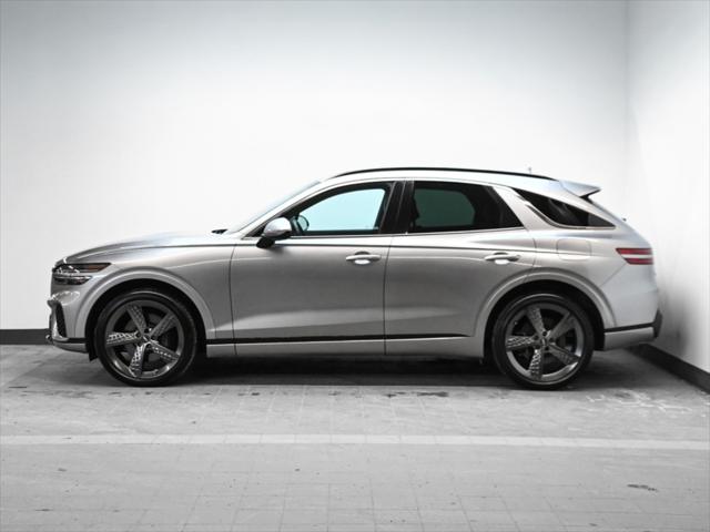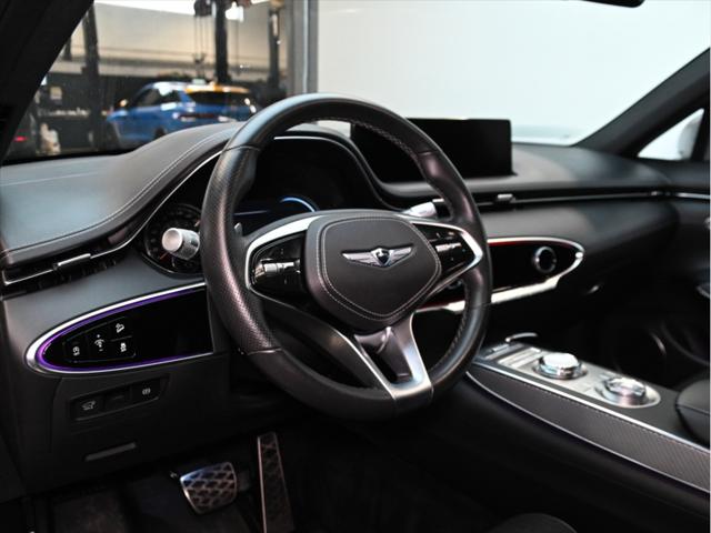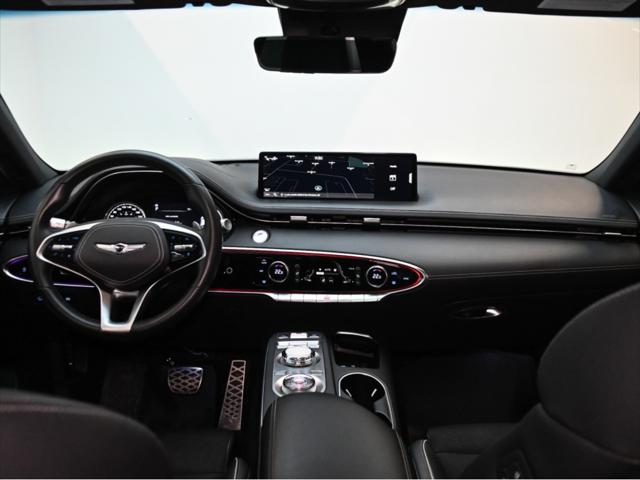 Groupe motopropulseur Moteur : V6 biturbo de 3 5 L Puissance : 375 ch à 5 800 tr/min Couple : 391 lb-pi de 1 300 à 4 500 tr/min Transmission : Automatique à 8 rapports Traction : Traction intégrale (AWD) Consommation de carburant (L/100 km – approx.) Ville : 13 1 Route : 10 5 Combinée : 11 9 Suspension et performance Suspension sport Suspension à contrôle électronique avec lecture de la route Différentiel arrière à glissement limité Sélecteur de modes de conduite (Éco Confort Sport Sport+ Personnalisé) Habitacle et confort Capacité : 5 passagers Sièges garnis de cuir Nappa Sièges avant à réglages électriques avec mémoire (conducteur) Sièges avant chauffants et ventilés Sièges arrière chauffants Volant chauffant Climatisation automatique à deux zones Toit ouvrant panoramique Pédales sport en aluminium Garnitures intérieures sport avec inserts en fibre de carbone Multimédia et technologie Écran tactile HD de 14 5 pouces Système de navigation Genesis Apple CarPlay et Android Auto™ Système audio haut de gamme Lexicon (15 haut-parleurs) Recharge sans fil pour téléphone intelligent Affichage tête haute Tableau de bord numérique Sécurité et aides à la conduite Assistance à lévitement de collision frontale Assistance à lévitement de collision dans les angles morts Moniteur dangles morts avec affichage Assistance à la conduite sur autoroute Régulateur de vitesse adaptatif avec arrêt-redémarrage Assistance au maintien et au suivi de voie Assistance à lévitement de collision transversale arrière Moniteur à vue panoramique (caméra 360°) Aide au stationnement intelligent à distance Extérieur Jantes sport en alliage de 21 pouces Quatre sorties déchappement Pare-chocs avant et arrière sport Calandre et garnitures en chrome foncé Phares et feux arrière à DEL Capacité de remorquage Jusquà 3 500 lb